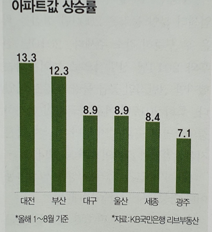 그럼 올해 8월까지 수도권을 제외한 주요 도시 아파트 상승률은 얼마나 될까요?